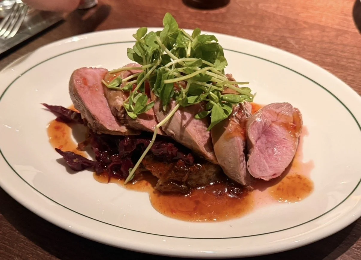 For the main course, the seared duck breast was a highlight, served with braised red cabbage, sautéed greens, and a chilli and mango salsa that brought everything together beautifully.