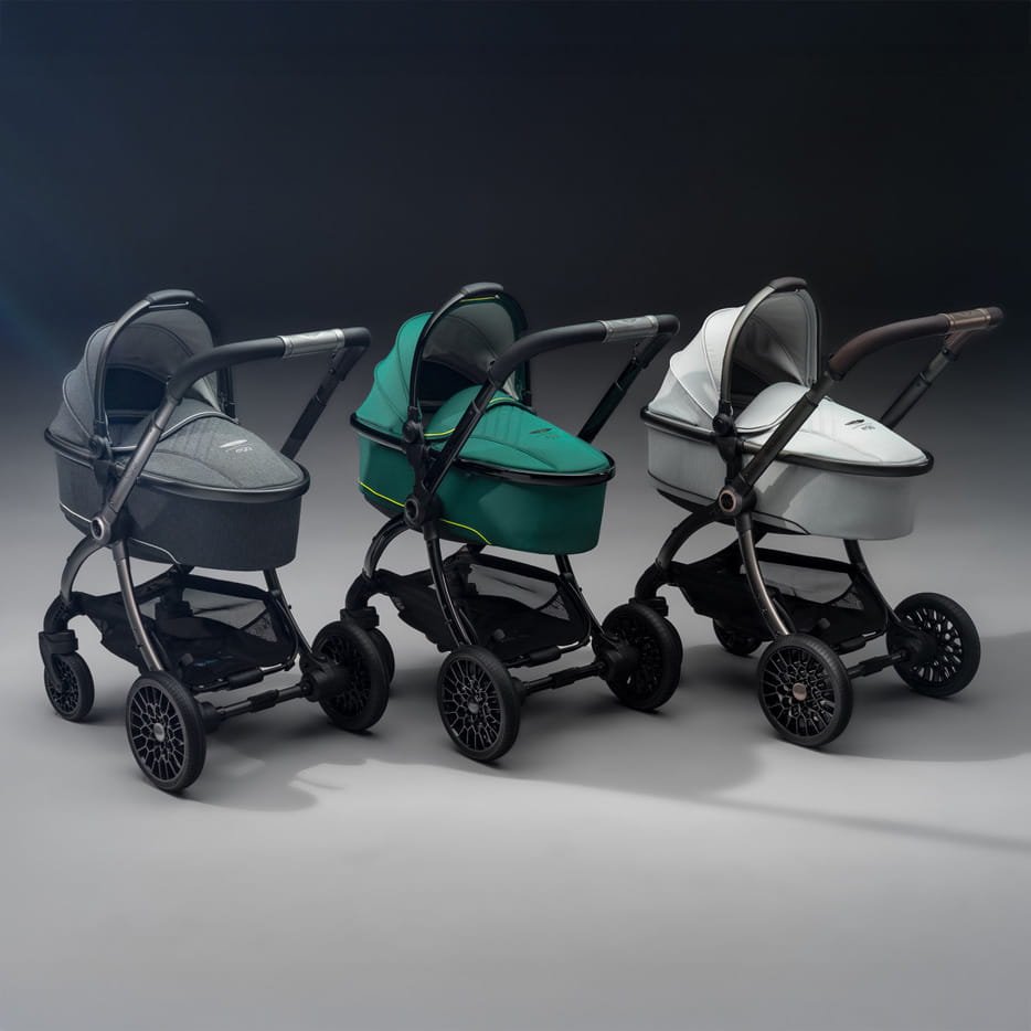By egg Stroller in collaboration with Aston Martin, this limited-edition stroller is pure design excellence. Inspired by models like the Valour and Victor, it features honeycomb wheels with Tru-Ride technology, refined quilting, and impeccable detailing. Price around £2,500.