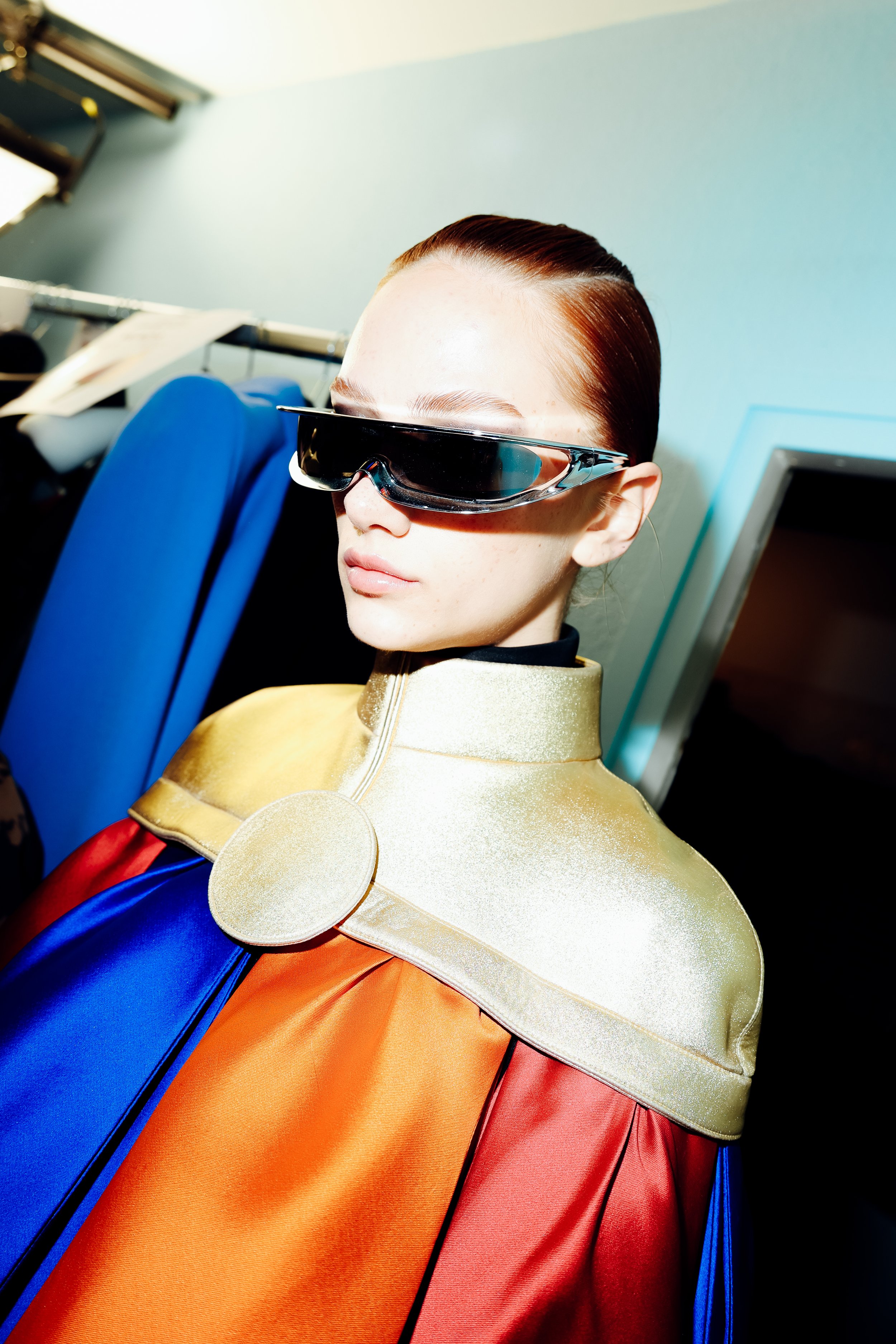 The colour palette further reinforces the futuristic character of the collection. Metallic tones, deep black and optic white appear alongside intense shades such as electric blue and vibrant red. This combination creates a graphic contrast that amplifies the visual impact of the garments.