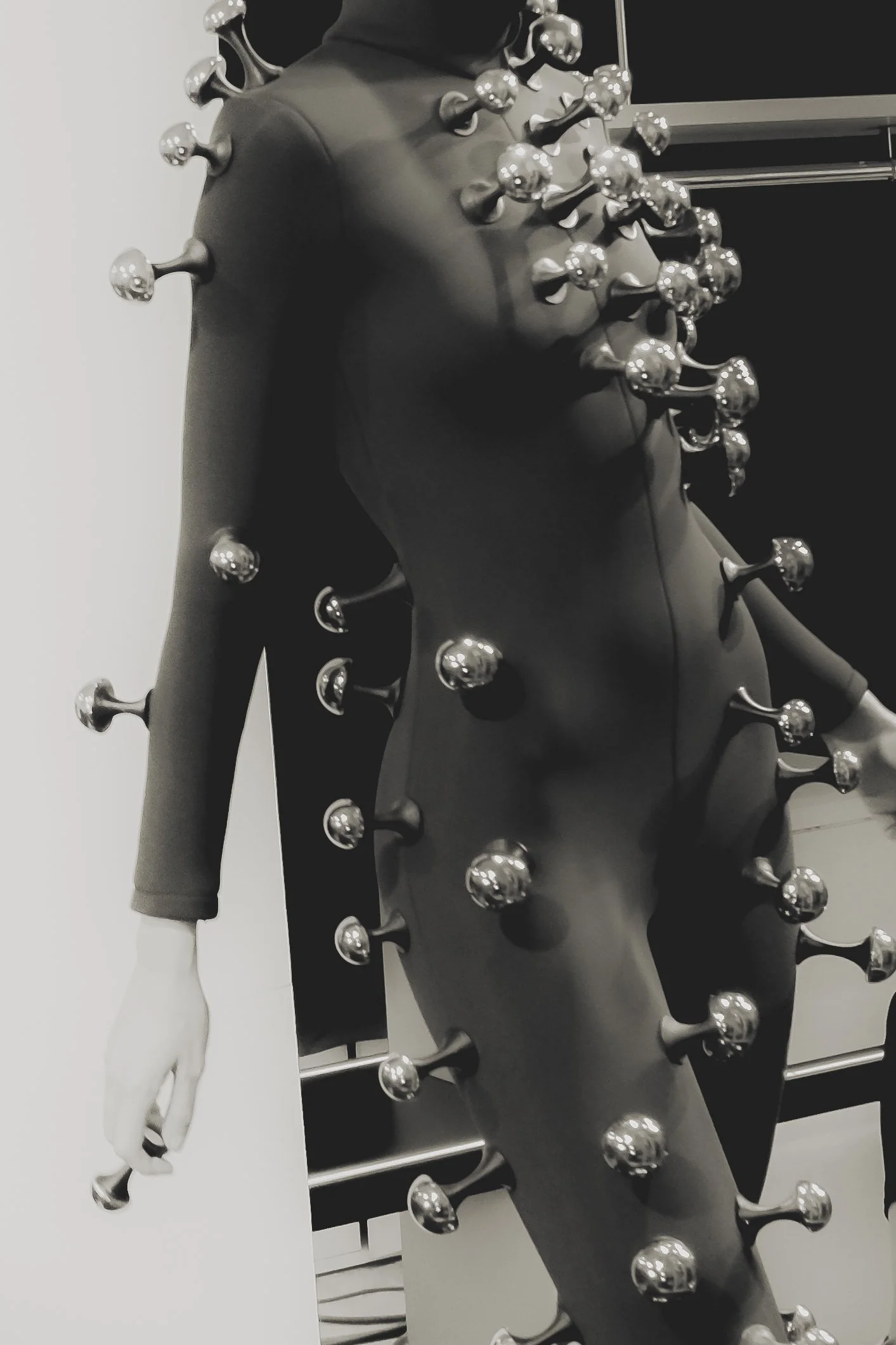 From the very first looks, the collection revealed itself as an experiment between fashion and sculpture. The base pieces were jumpsuits or clean silhouettes that served as neutral platforms for the layering of three-dimensional elements such as discs, circular structures, floating panels, and asymmetrical ornaments.