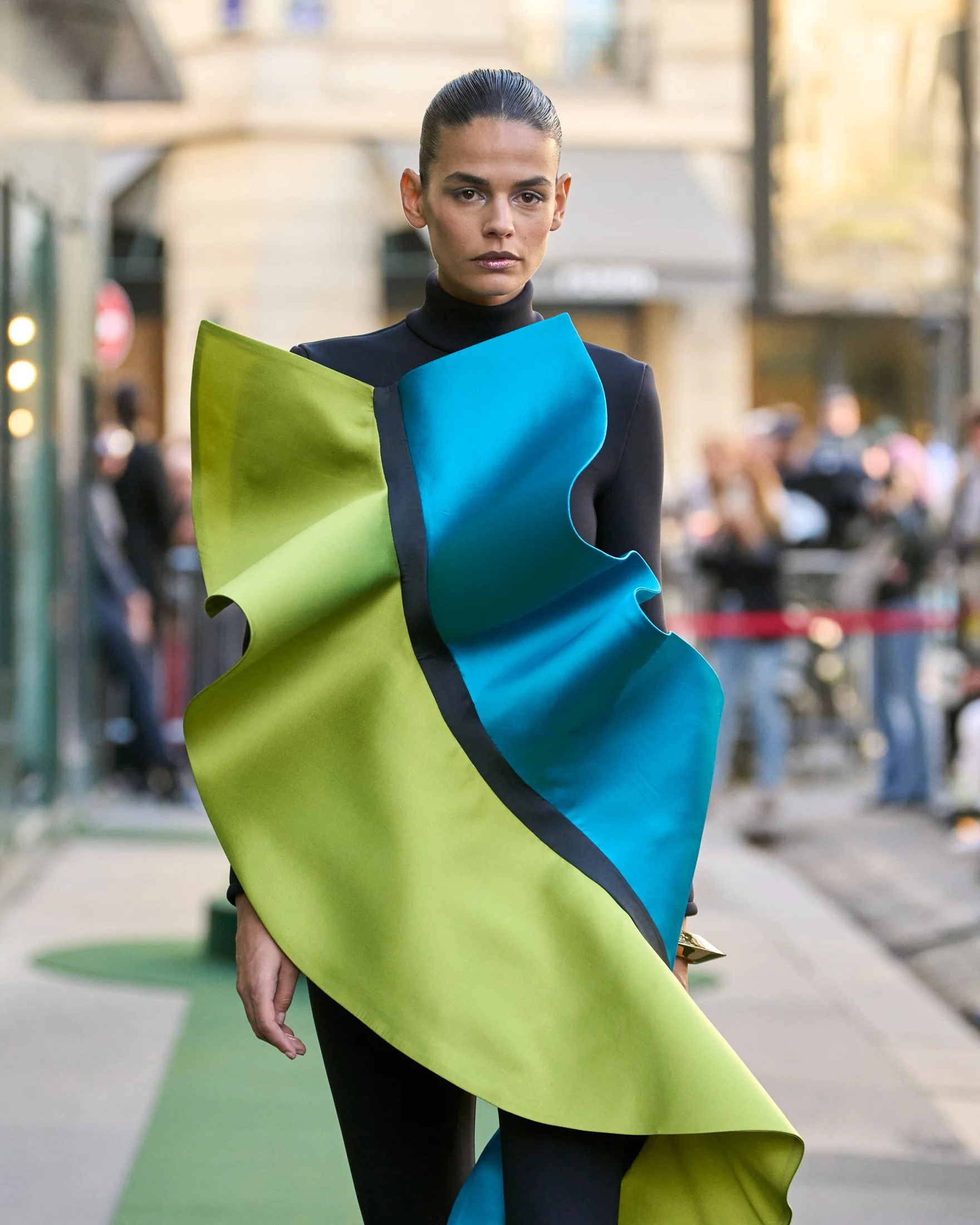 In terms of materials, the maison explored technical fabrics, transparencies, and applied architectural elements. Rodrigo Basilicati, the creative director of the house, together with his team, is deeply committed to environmental impact and once again brings a strong presence of eco-friendly fabrics, deadstock materials (“stocks dormants”), and state-of-the-art technical fibres.