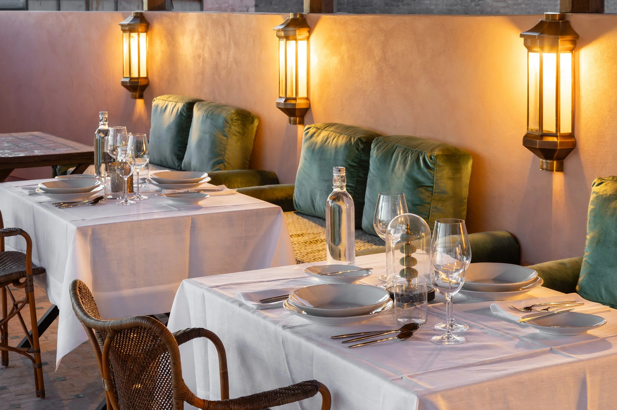 Everything here is done with purpose. From the art (some painted by the founder’s grandfather) to the cutlery and cushions. Even the plates have stories. And the view from the rooftop? You can see the Koutoubia Mosque, the mountains, and the whole Medina breathing around you.