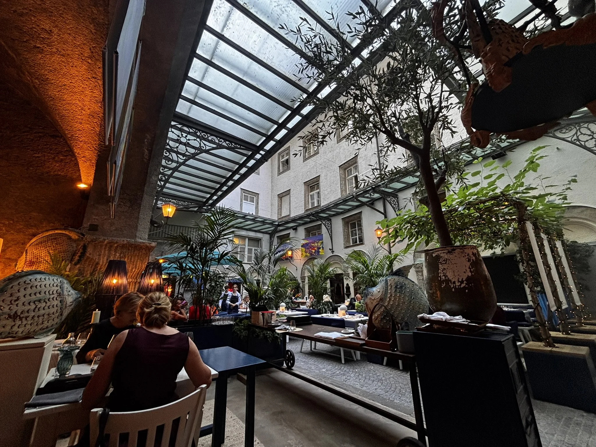 Today, St. Peter is divided into two concepts. ACTHUNDERT & DREI offers formal dining inside the historic building, while PETER provides a more contemporary space with Mediterranean-inspired dishes. Both celebrate Austrian culinary tradition while embracing modern creativity.
